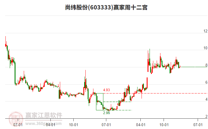 今天603333尚緯股份漲停,等距時間周期線顯示近期時間窗1月12日