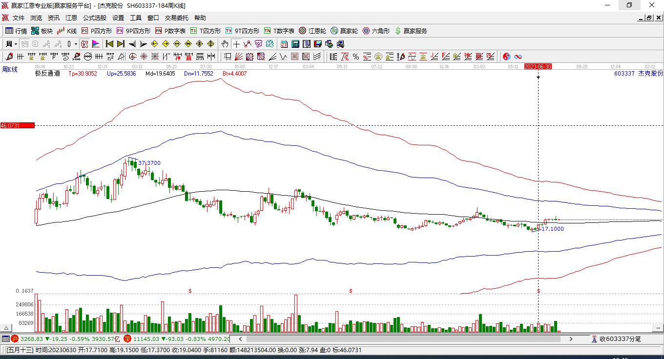 杰克科技處于贏家江恩多頭中期回調(diào)形態(tài),12月17日發(fā)出江恩筑底信號后,經(jīng)過44日,今日形成短期筑頂信號,短期多頭趨勢已被破壞,中長線均在空頭下跌趨勢中。杰克科技今日跳空低開,截止目前K線呈現(xiàn)穿頭破腳小