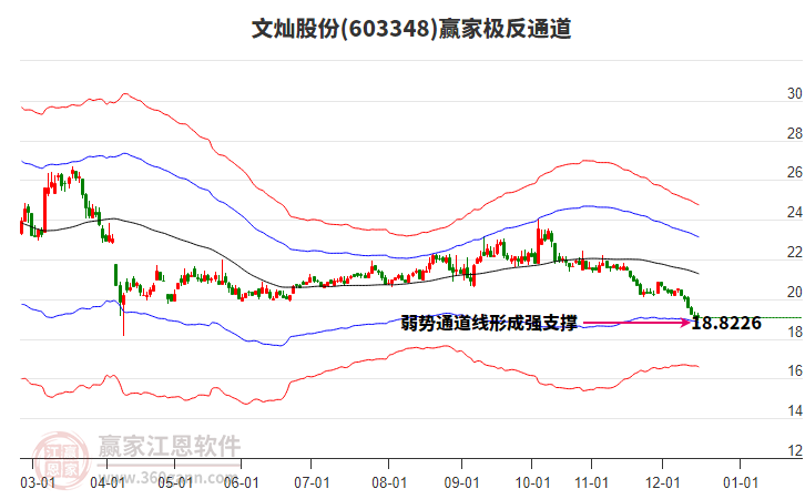 依據(jù)贏家江恩系統(tǒng)趨勢(shì)工具極反通道分析判斷文燦股份603348運(yùn)行在生命線(xiàn)以下弱勢(shì)區(qū)域,根據(jù)規(guī)則該股短線(xiàn)輕倉(cāng)參與,股價(jià)跌至弱勢(shì)外軌線(xiàn)后波段再結(jié)合其它工具信號(hào)建倉(cāng)。應(yīng)用口訣是:生命線(xiàn)上強(qiáng)勢(shì)走,生命線(xiàn)下難抬頭;紅黃兩條外軌線(xiàn),壓力支撐顯勢(shì)頭。