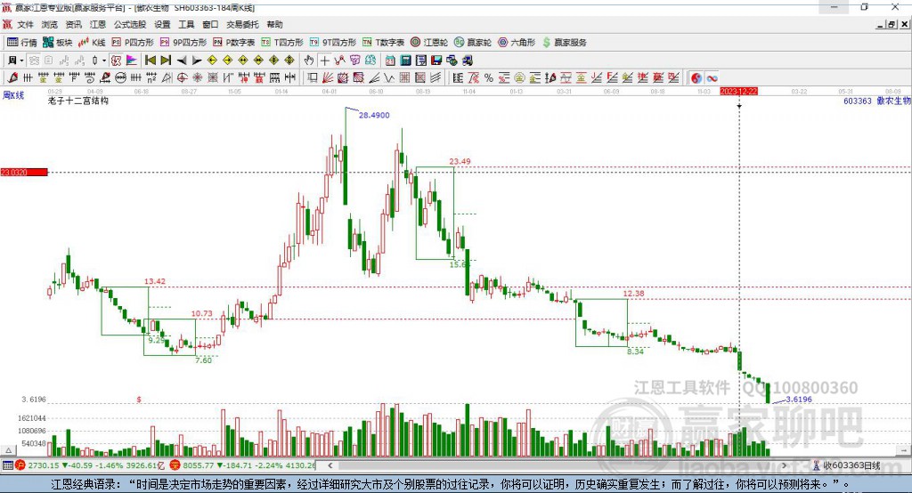 依據(jù)贏家江恩極反通道趨勢(shì)工具展示,本周跌破生命線,進(jìn)入弱勢(shì)通道, 依據(jù)極反通道規(guī)則,失守一線,看低一線,短期走弱,若此處不能收復(fù)生命線,則繼續(xù)下探至弱勢(shì)通道線附近尋找支撐。