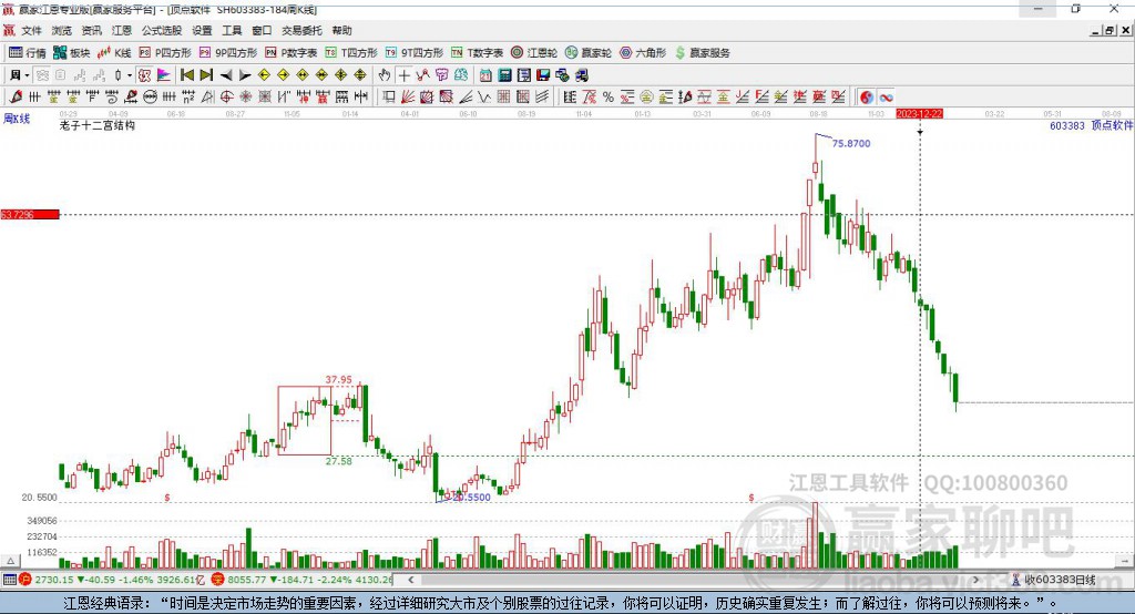 頂點(diǎn)軟件(603383)處于贏家江恩多頭中期回調(diào)形態(tài),12月5日發(fā)出江恩筑底信號(hào)后,經(jīng)過(guò)26日,今日形成短期筑頂信號(hào),短期多頭趨勢(shì)已被破壞,中長(zhǎng)線均在空頭下跌趨勢(shì)中。頂點(diǎn)軟件(603383)根據(jù)贏家江