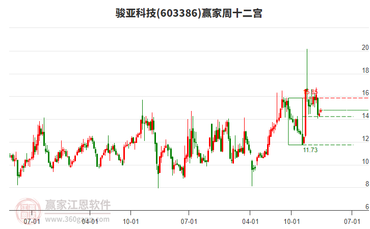 603386駿亞科技根據(jù)贏家江恩極反通道趨勢(shì)工具展示,上方壓力位16.5925,下方支撐位14.0155。603386駿亞科技處于贏家江恩多頭主線形態(tài),12月23日發(fā)出江恩筑頂信號(hào)后,經(jīng)過6日,今日再