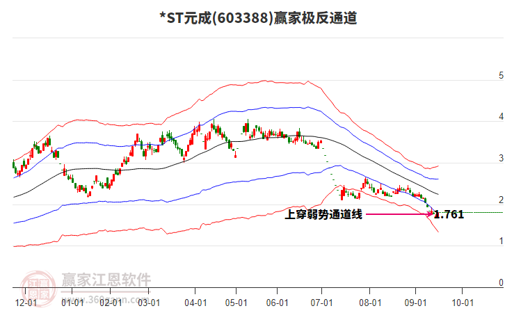 依據(jù)贏家江恩系統(tǒng)趨勢工具極反通道分析判斷ST元成603388運行在生命線以下弱勢區(qū)域,根據(jù)規(guī)則該股短線輕倉參與,股價跌至弱勢外軌線后波段再結(jié)合其它工具信號建倉。應(yīng)用口訣是:生命線上強勢走,生命線下難抬頭;紅黃兩條外軌線,壓力支撐顯勢頭。