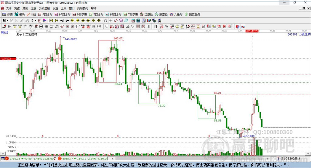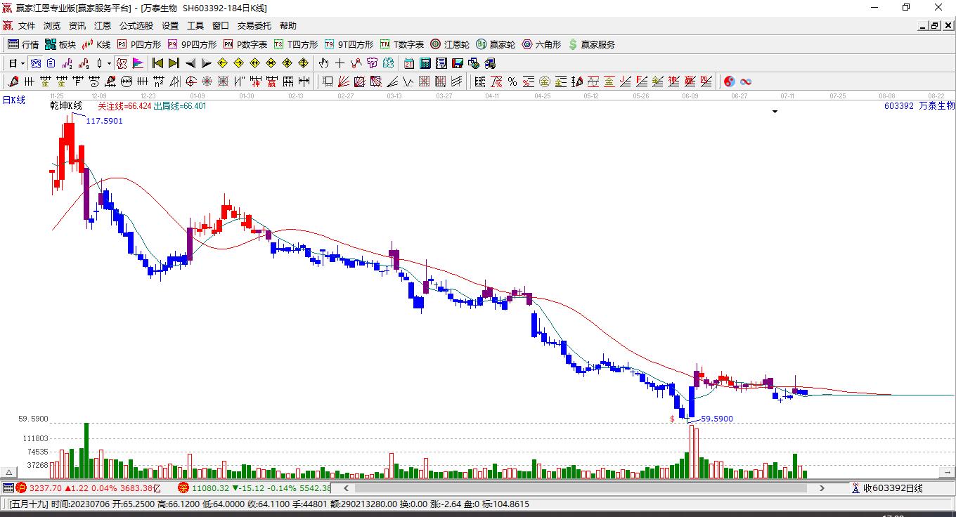 萬泰生物(603392)處于贏家江恩空頭主線形態(tài),從1月14日形成頂分型后持續(xù)下跌,今日形成短期初次筑頂信號,短期多頭趨勢已被破壞,中長線均在空頭下跌趨勢中。萬泰生物今日跳空低開,截止目前K線呈現(xiàn)穿頭