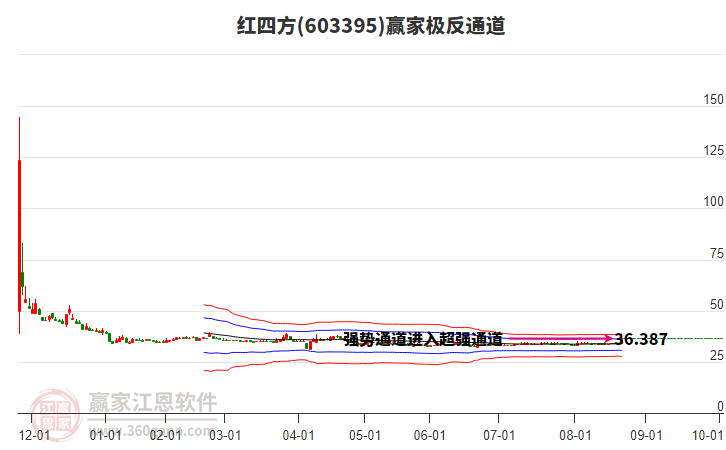 依據(jù)贏家江恩系統(tǒng)趨勢工具極反通道分析判斷紅四方603395運(yùn)行在生命線以下弱勢區(qū)域,根據(jù)規(guī)則該股短線輕倉參與,股價(jià)跌至弱勢外軌線后波段再結(jié)合其它工具信號建倉。應(yīng)用口訣是:生命線上強(qiáng)勢走,生命線下難抬頭;紅黃兩條外軌線,壓力支撐顯勢頭。