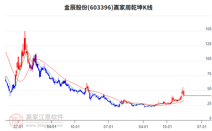 今日金辰股份603396上穿上方紅色外軌線 以上影中陽線收盤