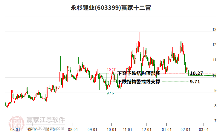 永杉鋰業(yè)(603399)處于贏家江恩空頭主線形態(tài),今日重心下移,形成短期筑頂信號(hào),長期發(fā)出江恩筑頂信號(hào),注意風(fēng)險(xiǎn)規(guī)避。永杉鋰業(yè)(603399)根據(jù)贏家江恩極反通道趨勢(shì)工具展示,上方壓力位11.0815