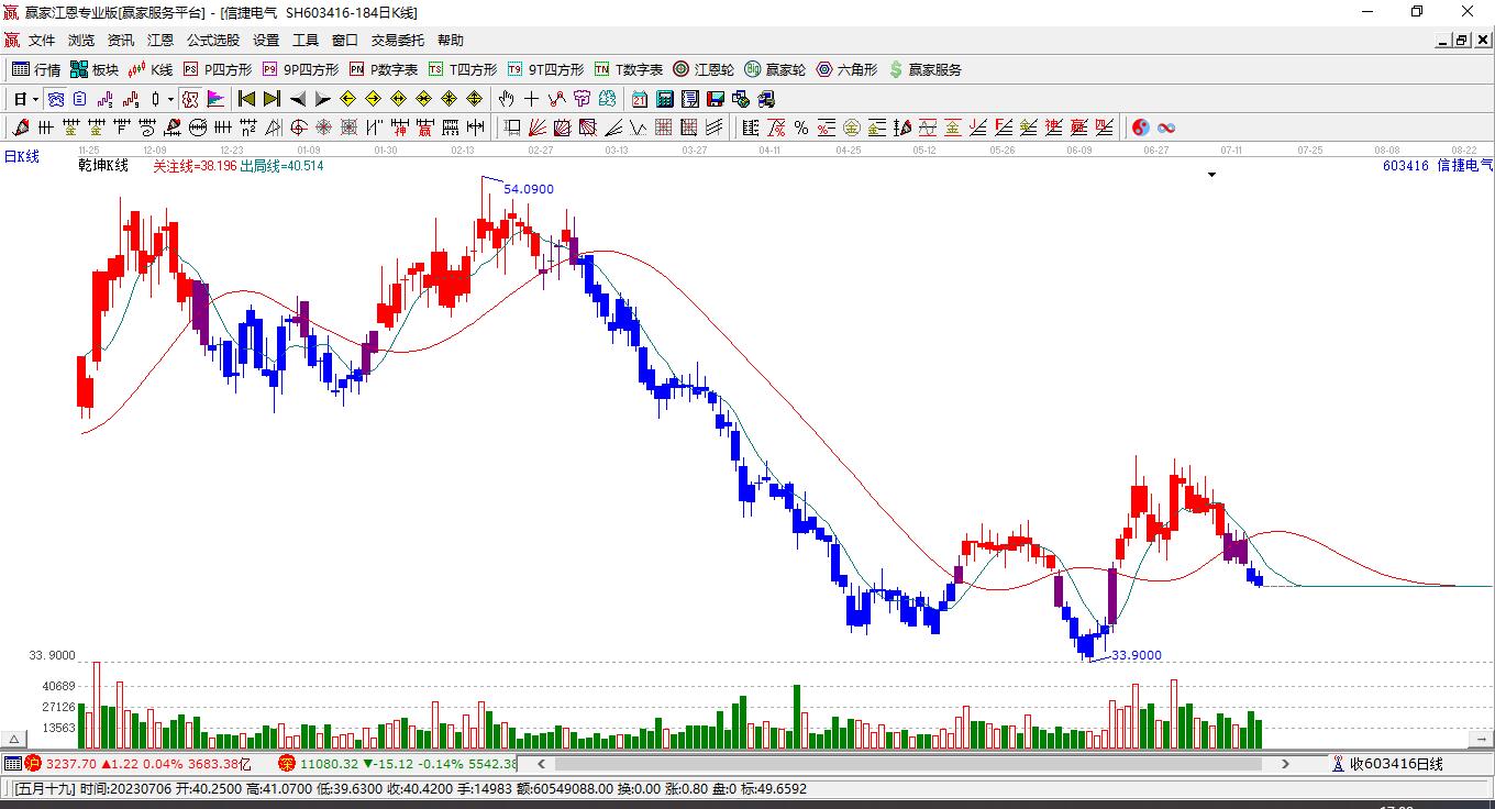 信捷電氣處于贏家江恩多頭中期回調(diào)形態(tài),12月8日發(fā)出江恩筑底信號(hào)后,經(jīng)過43日,今日形成短期筑頂信號(hào),短期多頭趨勢(shì)已被破壞,中期多頭反彈趨勢(shì)延續(xù),但長期處于回調(diào)中。信捷電氣今日跳空低開,截止目前K線呈