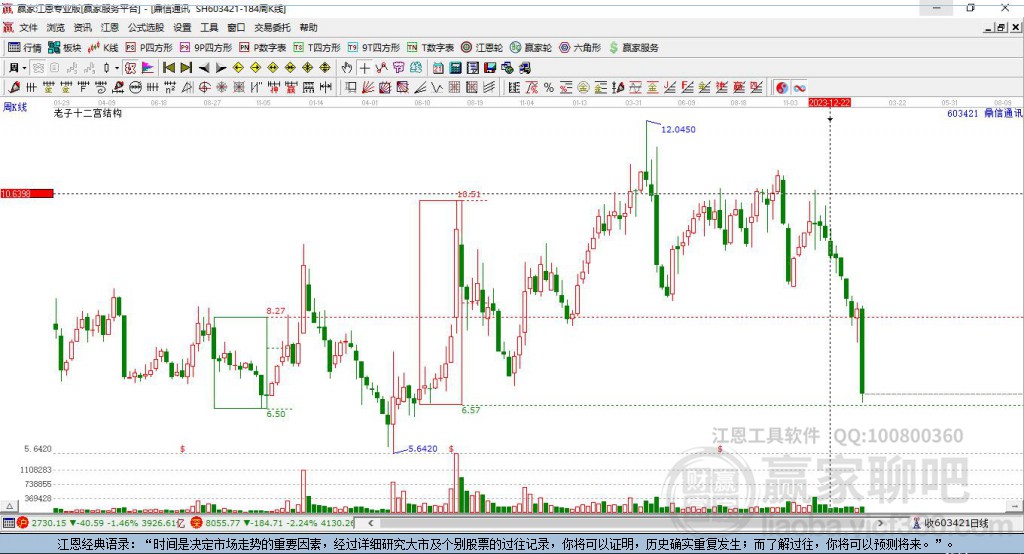 依據(jù)贏家十二宮結構模型工具展示,本周股價上穿前期2024年2月8日形成的下跌結構警戒線8.03。依據(jù)贏家十二宮多空能量守恒規(guī)則,下跌結構警戒線是多空能量平衡點,突破或跌破往往意味著平衡打破。 本周突破警戒線,多方能量主導上攻,有望在下跌結構頂部線10.36附近將會形成新的多空能量平衡位。