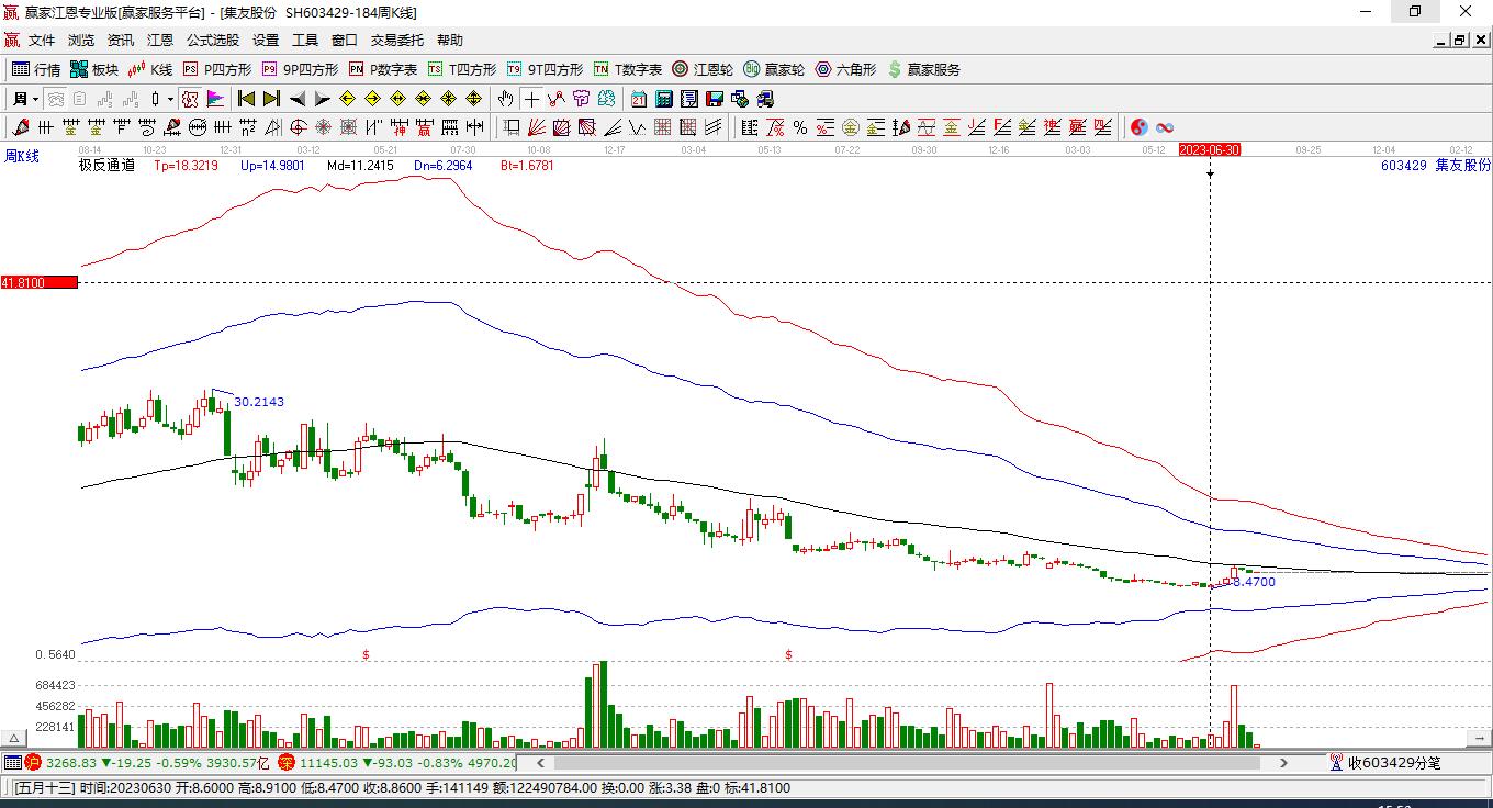依據(jù)贏家江恩極反通道趨勢(shì)工具展示,本周股價(jià)處于生命線上強(qiáng)勢(shì)通道,本周收盤價(jià)11.07,自近期通道內(nèi)高點(diǎn)12.2持續(xù)下跌至本周,到達(dá)生命線9.5111點(diǎn)上方,短期關(guān)注此線支撐,如支撐不破,保持在強(qiáng)勢(shì)通道內(nèi),波段繼續(xù)看多,有望再次挑戰(zhàn)藍(lán)色上軌線。若跌破生命線9.5111,進(jìn)入弱勢(shì)通道,打開下跌空間。