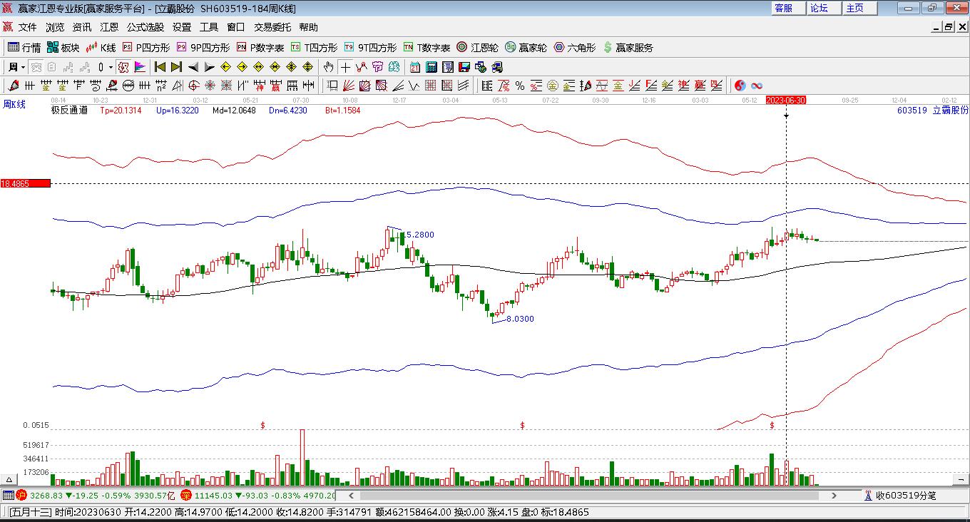 依據(jù)贏家江恩極反通道趨勢(shì)工具展示,本周股價(jià)處于生命線上強(qiáng)勢(shì)通道,本周收盤價(jià)13.52,自近期通道內(nèi)低點(diǎn)11.38上漲至本周,到達(dá)生命線12.1702點(diǎn)上方,短期關(guān)注此線支撐,如支撐不破,保持在強(qiáng)勢(shì)通道內(nèi),波段繼續(xù)看多,有望挑戰(zhàn)藍(lán)色上軌線。若跌破生命線12.1702,進(jìn)入弱勢(shì)通道,調(diào)整周期繼續(xù)延長(zhǎng)。