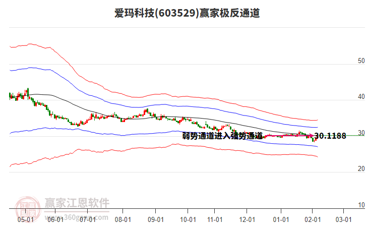 依據(jù)贏家江恩系統(tǒng)趨勢工具極反通道分析判斷愛瑪科技603529運行在生命線以下弱勢區(qū)域,根據(jù)規(guī)則該股短線輕倉參與,股價跌至弱勢外軌線后波段再結(jié)合其它工具信號建倉。應(yīng)用口訣是:生命線上強勢走,生命線下難抬頭;紅黃兩條外軌線,壓力支撐顯勢頭。