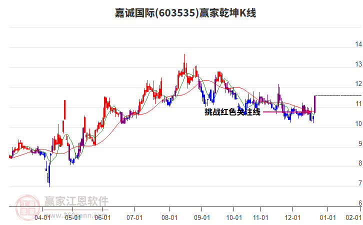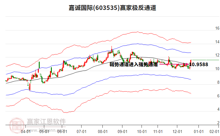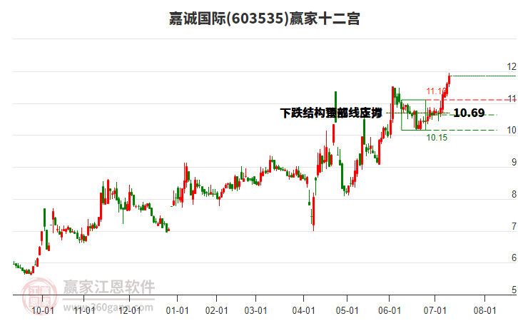 603535嘉誠國際處于贏家江恩多頭中期回調(diào)形態(tài),從12月19日形成底分型后持續(xù)上攻,今日突破前高形成初次江恩筑底信號,中期多頭反彈趨勢延續(xù),但長期處于回調(diào)中。603535嘉誠國際根據(jù)贏家江恩極反通道