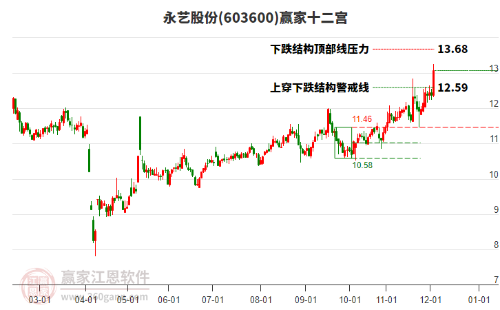 2月13日股價(jià)處于前期2025年10月9日形成的下跌結(jié)構(gòu)頂部線(xiàn)11.46上方,近期股價(jià)在此位置呈現(xiàn)震蕩走勢(shì),震蕩區(qū)間為11.52-12.09,今日收盤(pán)價(jià)11.71,微跌0.93%。依據(jù)贏家十二宮多空能量守恒規(guī)則,下跌結(jié)構(gòu)頂部線(xiàn)是多空能量轉(zhuǎn)換的關(guān)鍵位置,多方能量已連續(xù)釋放,空方能量不斷聚集。當(dāng)前股價(jià)若能站穩(wěn)下跌結(jié)構(gòu)頂部線(xiàn)11.46,多方有望再一次發(fā)動(dòng)上攻,若跌破下跌結(jié)構(gòu)頂部線(xiàn),則股價(jià)將會(huì)向下警戒線(xiàn)位置附近尋找新的平衡位。