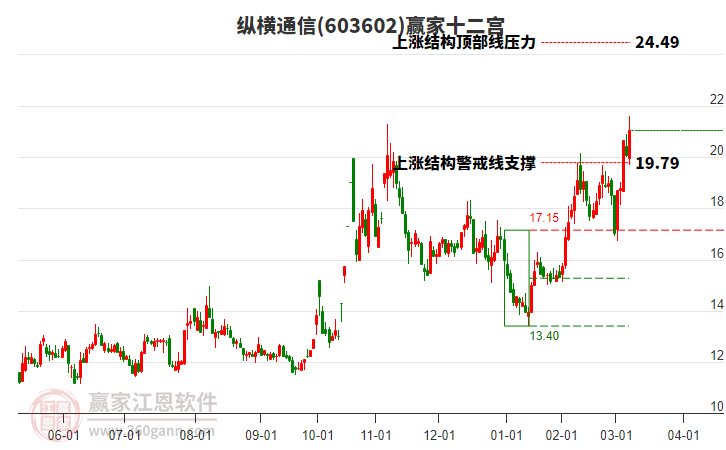 603602縱橫通信處于贏家江恩多頭次主線形態(tài),從1月14日形成頂分型后持續(xù)下跌,重心下移,今日跌破前低形成短期初次筑頂信號(hào),短期多頭趨勢(shì)已被破壞,中長(zhǎng)期目前都處于回調(diào)中。603602縱橫通信根據(jù)贏家