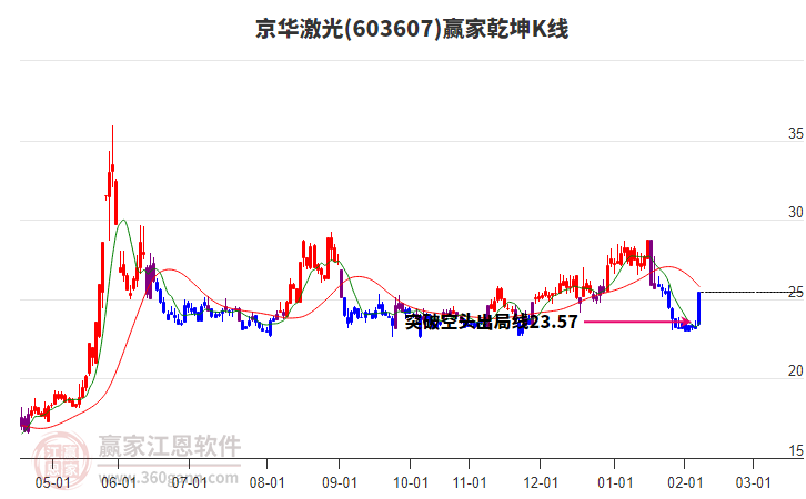 依據(jù)贏家江恩系統(tǒng)趨勢工具極反通道分析判斷京華激光603607運行在生命線以上強(qiáng)勢區(qū)域,根據(jù)規(guī)則該股可短線、波段結(jié)合操作;結(jié)合物極必反的原理通過分鐘圖做盤中差價,應(yīng)用口訣是:生命線上強(qiáng)勢走,生命線下難抬頭;紅黃兩條外軌線,壓力支撐顯勢頭。
