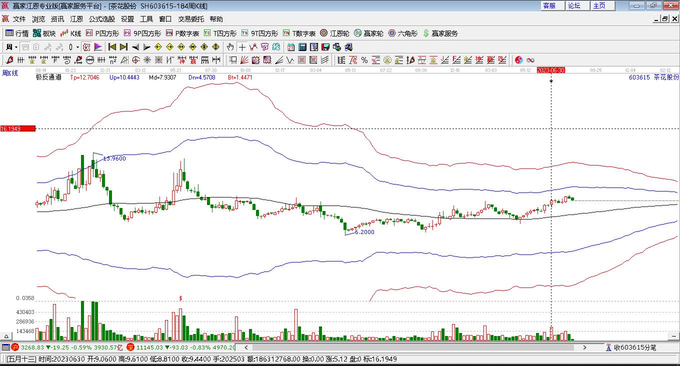 依據(jù)贏家江恩極反通道趨勢工具展示,本周股價處于弱勢通道內(nèi),近期自1月16日高點持續(xù)下跌至本周,跌幅達(dá)17.11%,依據(jù)贏家極反通道規(guī)則:站穩(wěn)一線看高一線,短期關(guān)注此線支撐,如支撐不破,短線有望展開反彈挑戰(zhàn)生命線。若跌破弱勢通道線8.8067,進(jìn)入超弱通道,打開下跌空間。