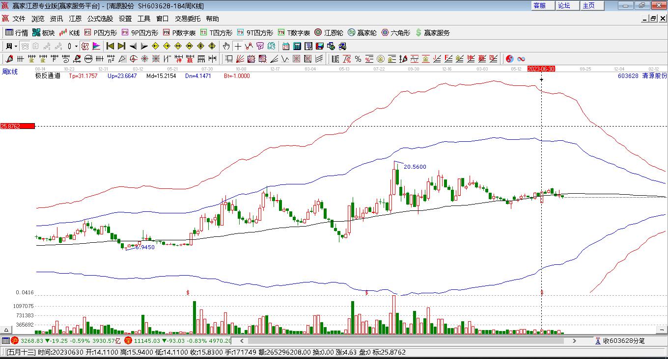 依據(jù)贏家江恩極反通道趨勢(shì)工具展示,本周股價(jià)處于生命線上強(qiáng)勢(shì)通道,本周收盤(pán)價(jià)14.18,自近期通道內(nèi)低點(diǎn)13.26上漲至本周,到達(dá)生命線13.0463點(diǎn)上方,短期關(guān)注此線支撐,如支撐不破,保持在強(qiáng)勢(shì)通道內(nèi),波段繼續(xù)看多,有望挑戰(zhàn)藍(lán)色上軌線。若跌破生命線13.0463,進(jìn)入弱勢(shì)通道,調(diào)整周期繼續(xù)延長(zhǎng)。