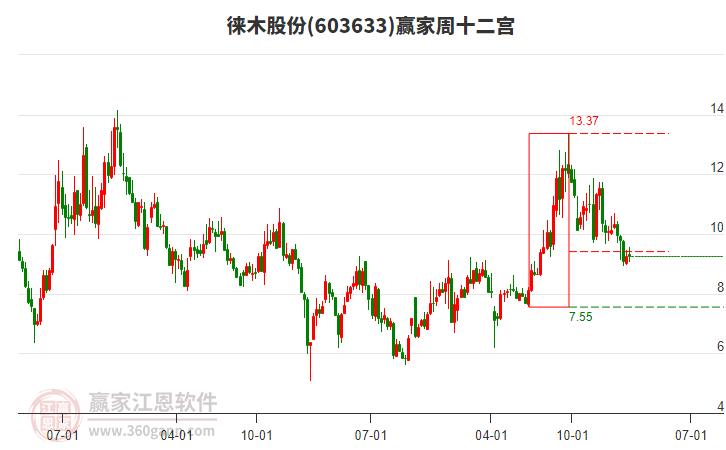 603633徠木股份在高點11.75后,回調(diào)了1.68元,在江恩價格循環(huán)線工具支撐位9.7元止跌上攻