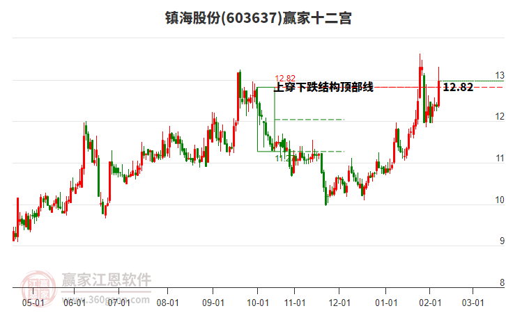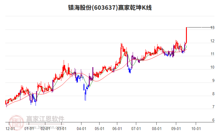 鎮(zhèn)海股份603637最高價上穿上方紅色外軌線 大幅上漲6.65%