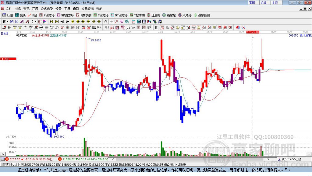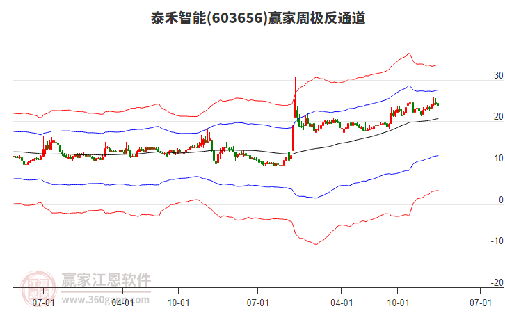 目前603656泰禾智能最高價25.67挑戰(zhàn)了贏家極反通道工具藍色外軌線,受到藍色外軌線強力壓制,最終收盤停留在在藍色外軌線與生命線上方的強勢通道區(qū)域。603656泰禾智能近10個交易日漲幅7.82%