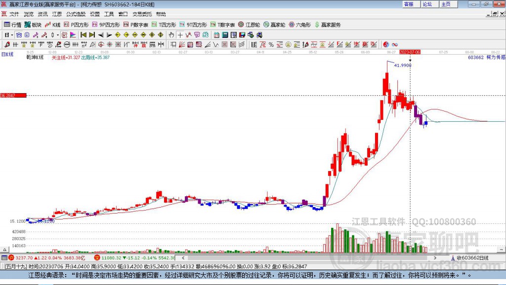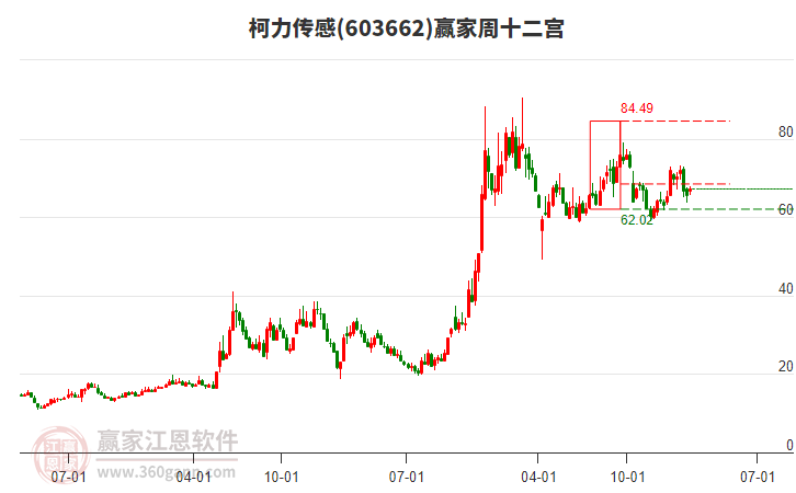 603662柯力傳感處于贏家江恩多頭中期回調(diào)形態(tài),今日重心下移,形成了頂分型,6月30日發(fā)出中期江恩筑底信號后,經(jīng)過210日,今日形成中期筑頂信號,若持續(xù)下跌,觸發(fā)長期筑頂信號,603662柯力傳感將