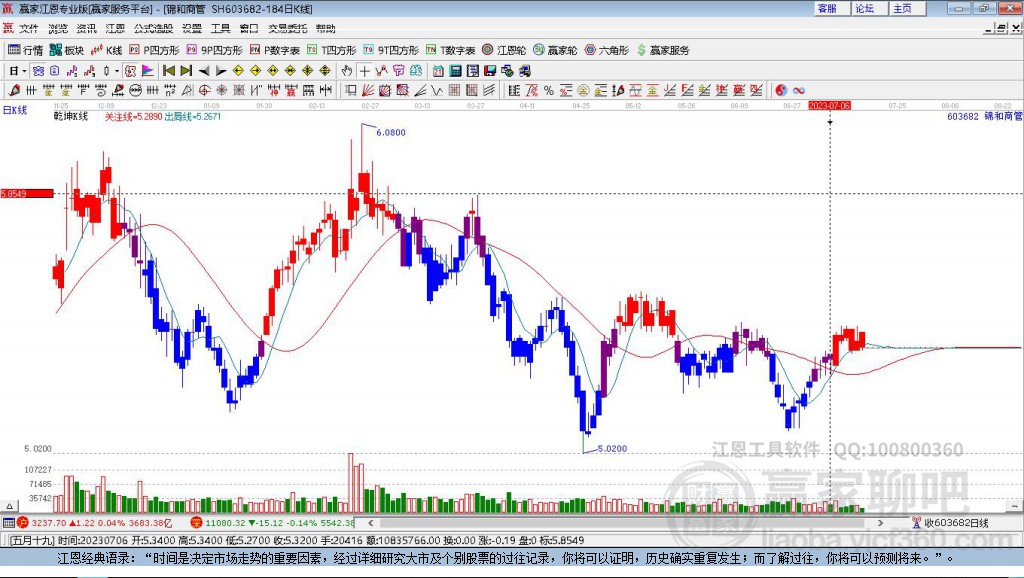 依據(jù)贏家江恩乾坤K線工具展示,本周K線以陽線收盤,目前K線處于紅色區(qū)域,位于關(guān)注線上方,依據(jù)贏家江恩乾坤K線多空模型,目前多頭出局線對當前股價形成支撐,短期看多。后市如若股價跌破多頭出局線,則可能形成短期回調(diào)。