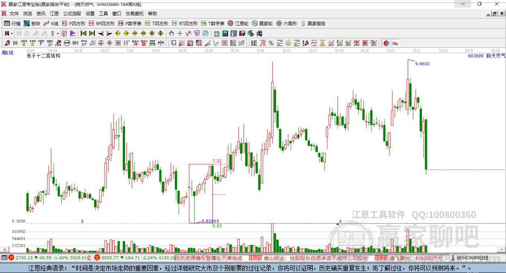 依據(jù)贏家江恩極反通道趨勢(shì)工具展示,該股于1月30日高點(diǎn)8.61,展開(kāi)一波下跌,本周跌破生命線,進(jìn)入弱勢(shì)通道, 依據(jù)極反通道規(guī)則,失守一線,看低一線,短期走弱,若此處不能收復(fù)生命線,則繼續(xù)下探至弱勢(shì)通道線附近尋找支撐。