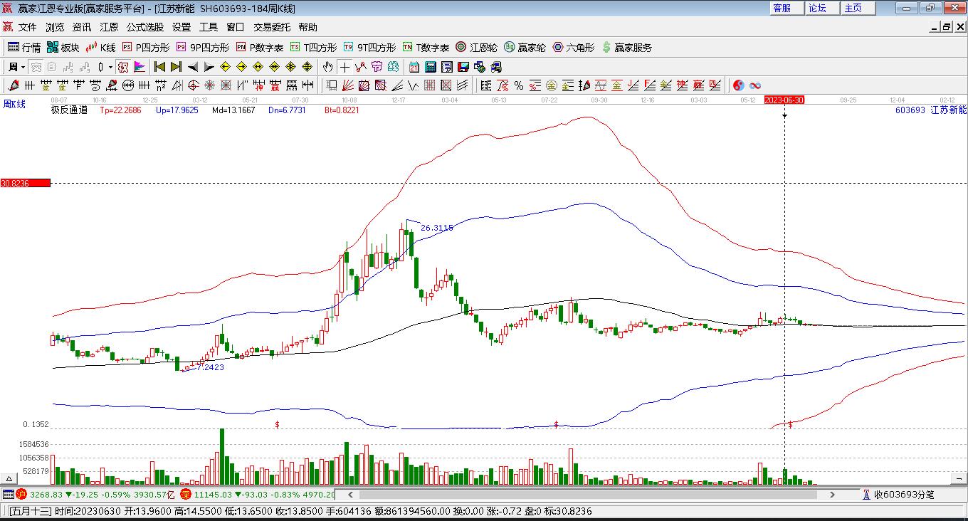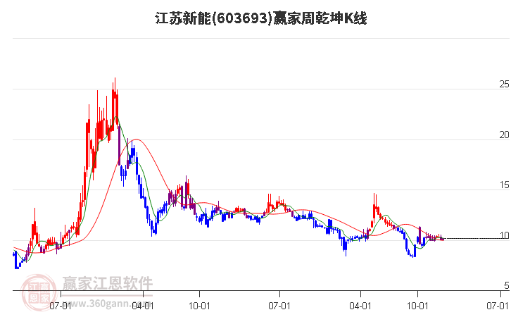 江蘇新能處于贏家江恩多頭中期回調(diào)形態(tài),從12月15日形成頂分型后持續(xù)下跌,重心下移,今日跌破前低形成短期初次筑頂信號,短期多頭趨勢已被破壞,中長線均在空頭下跌趨勢中。江蘇新能今日雖高開,截止目前股價低