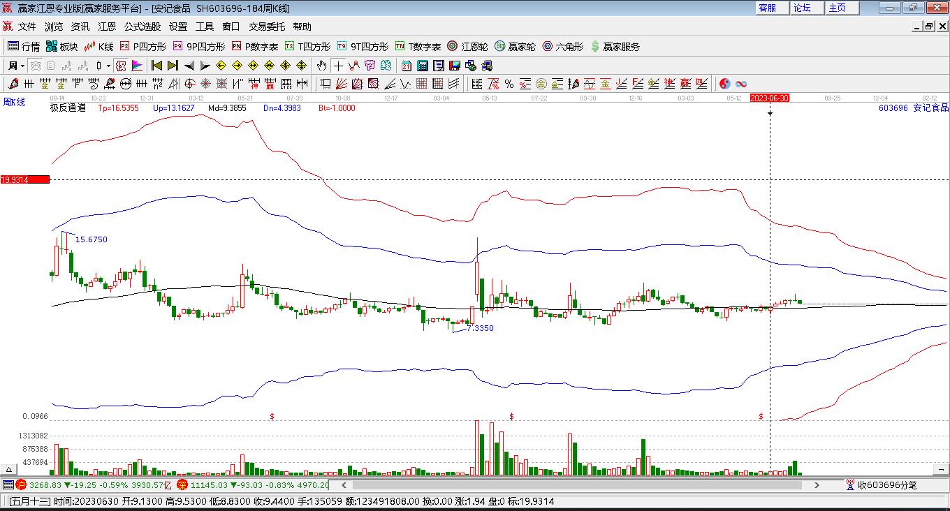 603696安記食品目前漲停,所屬板塊食品飲料、新零售、海峽西岸短期底分型后持續(xù)上攻。603696安記食品截止目前突破極反通道生命線,根據(jù)贏家江恩極反通道趨勢(shì)工具展示,上方壓力位27.9161,下方支