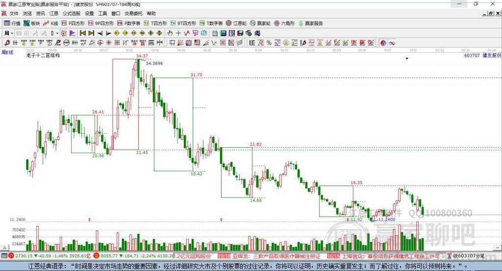 603707健友股份處于贏家江恩空頭主線形態(tài),從1月26日形成頂分型后持續(xù)下跌,今日形成短期初次筑頂信號,短期多頭趨勢已被破壞,中長線均在空頭下跌趨勢中。健友股份今日跳空低開,截止目前K線呈現(xiàn)上影陰線