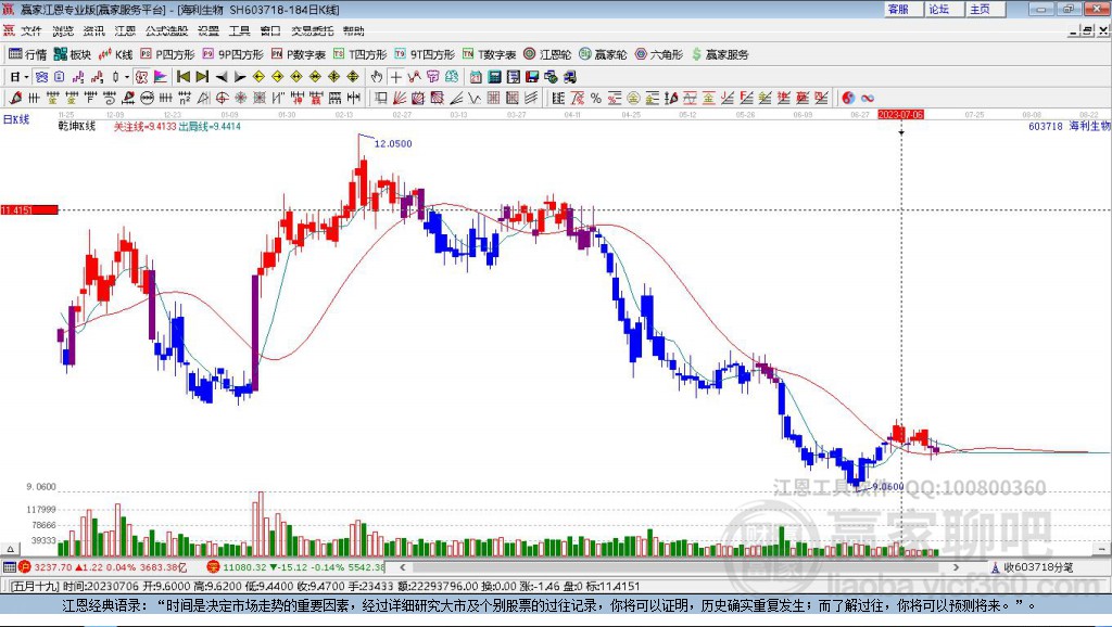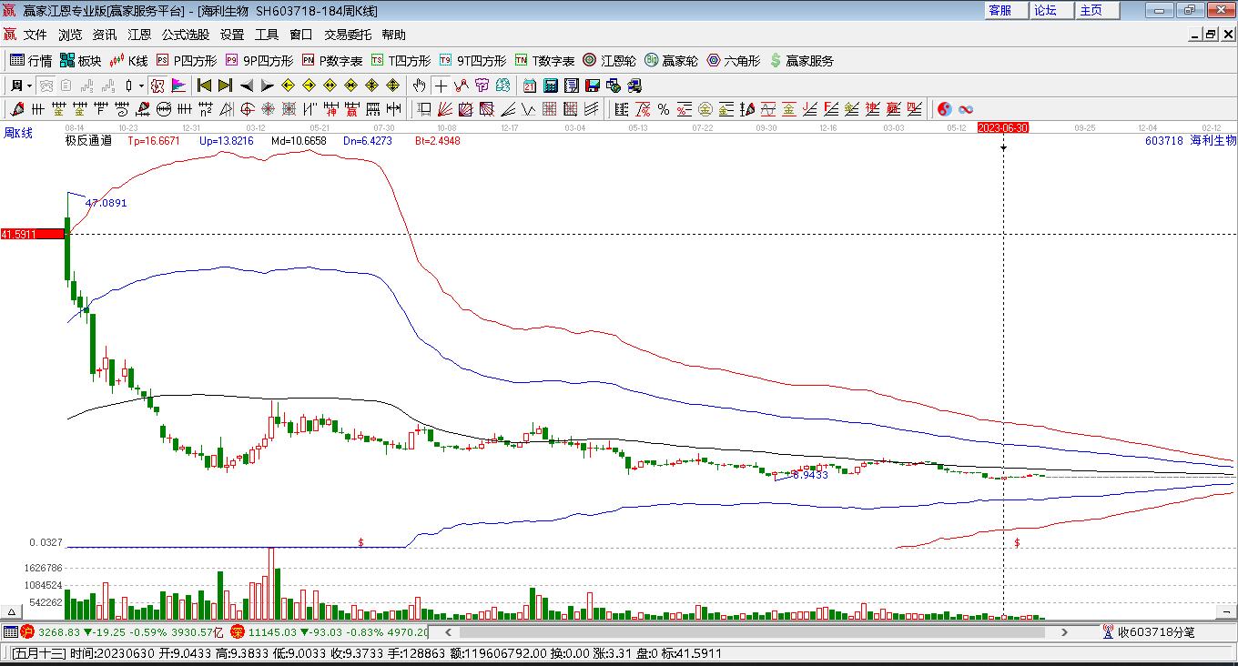 海利生物處于贏家江恩空頭主線形態(tài),從1月26日形成頂分型后持續(xù)下跌,今日形成短期初次筑頂信號(hào),短期多頭趨勢已被破壞,中長線均在空頭下跌趨勢中。海利生物K線為一字板跌停,一字板跌停往往代表空方能量強(qiáng)大,