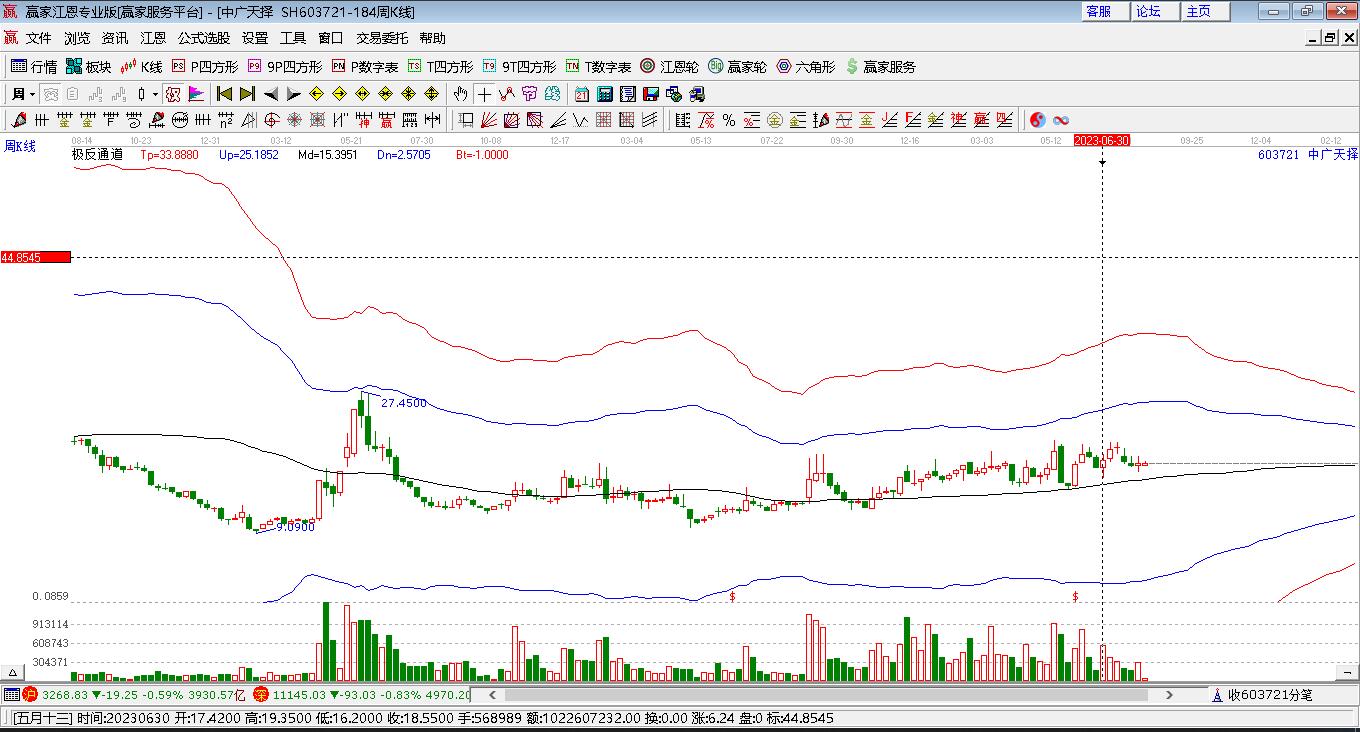 今天中廣天擇603721上穿藍(lán)色外軌線 以上下影小陰線收盤