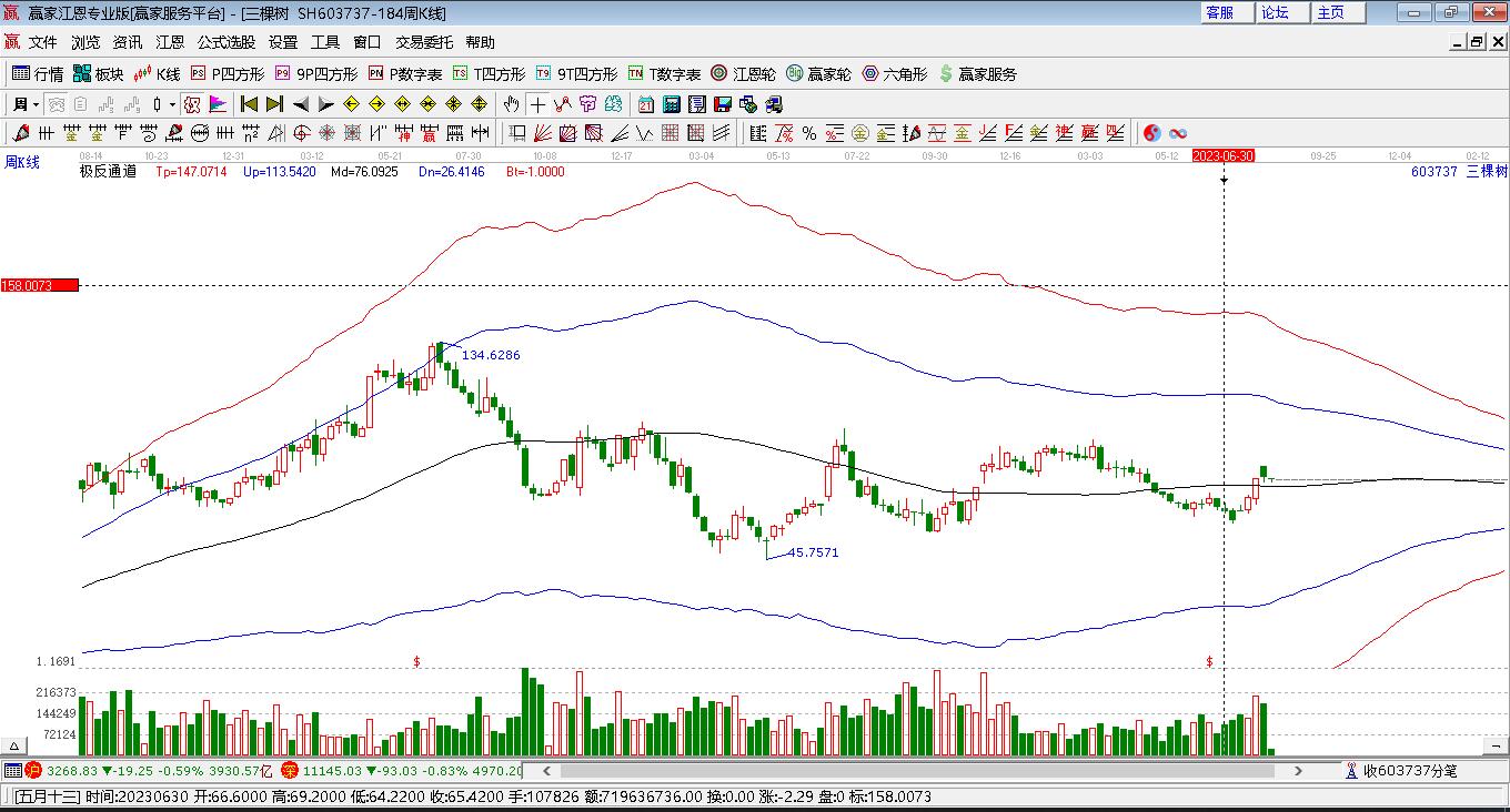 目前603737三棵樹最高價(jià)52.2上穿了贏家極反通道工具藍(lán)色外軌線,受到藍(lán)色外軌線強(qiáng)力壓制,最終收盤停留在在藍(lán)色外軌線與生命線上方的強(qiáng)勢(shì)通道區(qū)域。603737三棵樹近10個(gè)交易日漲幅9.57%。