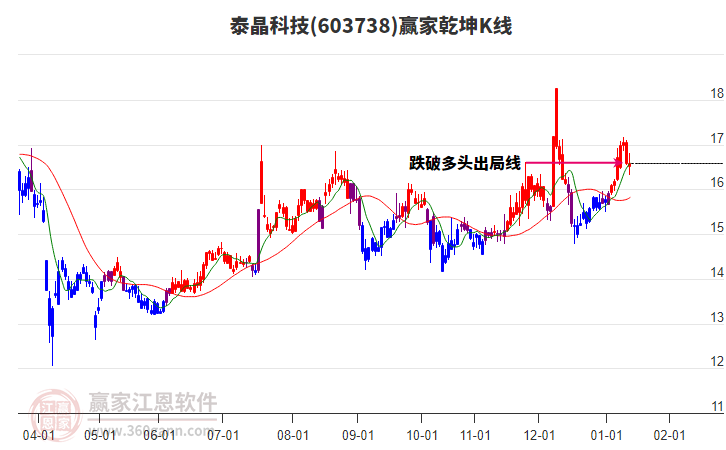 603738泰晶科技低開收陽線,突破江恩價格循環(huán)線工具壓力位16.72元