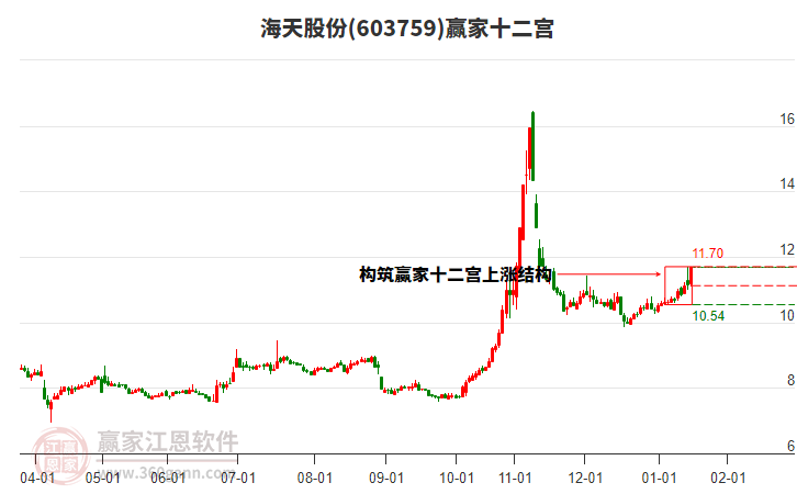 2月13日股價處于2026年1月21日形成的上漲結(jié)構(gòu)底部線10.54下方,今日股價微跌0.48%,以上影陰線收盤。目前以11.54-12.78價格區(qū)間進行上下震蕩。依據(jù)贏家十二宮多空能量守恒規(guī)則,若多方能量進行反攻,突破站穩(wěn)底部線,則有望向上在警戒線位置尋找新的多空能量平衡位。如不能突破站穩(wěn),后市有可能會再次下探。