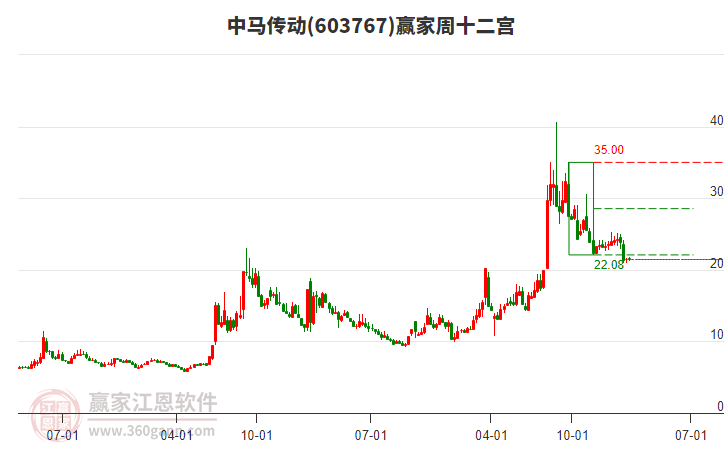中馬傳動(603767)在高點25.27后,回調(diào)了3.35元,到達(dá)波段百分比工具支撐位21.37元上