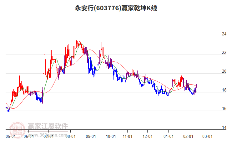 603776永安行低開(kāi)收穿頭破腳大陽(yáng)線,短期反彈到達(dá)波段百分比工具22.63元壓力位