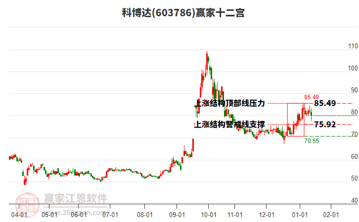 科博達(dá)(603786)處于贏家江恩多頭主線形態(tài),從12月17日形成底分型后持續(xù)上攻,今日突破前高形成初次江恩筑底信號,中長期目前都處于回調(diào)中??撇┻_(dá)(603786)根據(jù)贏家江恩極反通道趨勢工具展示,上