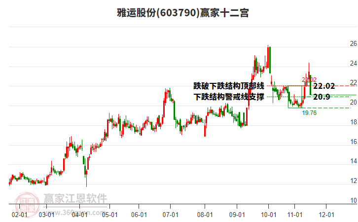 當(dāng)前股價位于前期2025年10月21日形成的下跌結(jié)構(gòu)頂部線26.03與警戒線23.13之間,該股自近期低點20.42,漲至今日23.51,共上漲3.09元,漲幅15.13%。依據(jù)贏家十二宮多空能量守恒規(guī)則,下跌結(jié)構(gòu)警戒線是多空能量平衡爭奪點,突破或跌破往往意味著平衡打破。當(dāng)前股價若能站穩(wěn)警戒線位置,多方能量有望主導(dǎo)上攻,向上頂部線位置尋找多空能量平衡位。如股價不能有效站穩(wěn)警戒線,則空方能量主導(dǎo)下探,向底部線附近尋找新的多空能量平衡位。