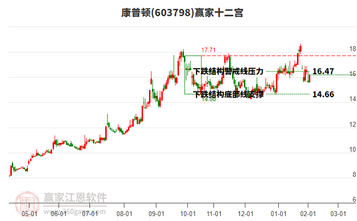 康普頓根據(jù)贏家江恩極反通道趨勢(shì)工具展示,上方壓力位18.5125,下方支撐位15.7735??灯疹D處于贏家江恩多頭次主線形態(tài),從1月23日形成頂分型后持續(xù)下跌,重心下移,今日跌破前低形成短期初次筑頂信
