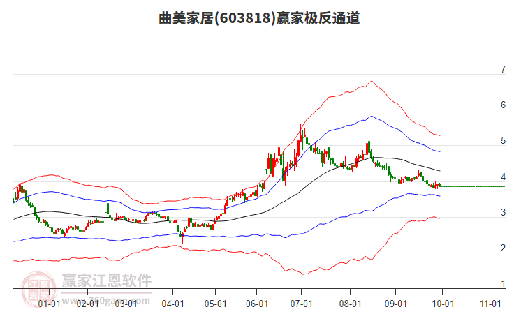依據(jù)贏家江恩系統(tǒng)趨勢工具極反通道分析判斷曲美家居603818運行在生命線以下弱勢區(qū)域,根據(jù)規(guī)則該股短線輕倉參與,股價跌至弱勢外軌線后波段再結(jié)合其它工具信號建倉。應(yīng)用口訣是:生命線上強勢走,生命線下難抬頭;紅黃兩條外軌線,壓力支撐顯勢頭。
