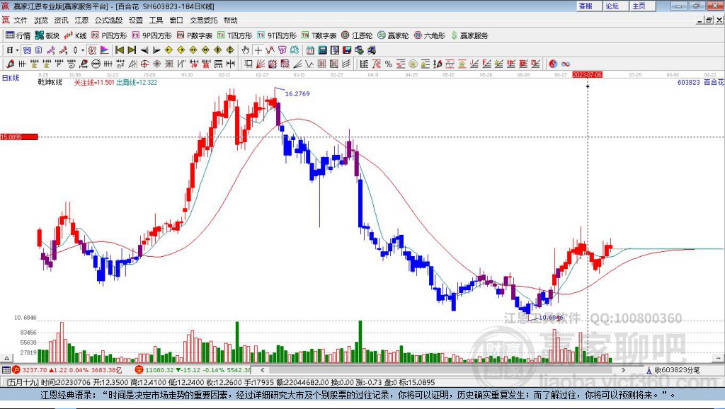 603823百合花處于贏家江恩多頭次主線形態(tài),1月12日發(fā)出江恩筑底信號(hào)后,經(jīng)過30日,今日形成短期筑頂信號(hào),短期多頭趨勢(shì)已被破壞,中期雖然處于回調(diào)中,但長期多頭趨勢(shì)延續(xù)。603823百合花根據(jù)贏家江
