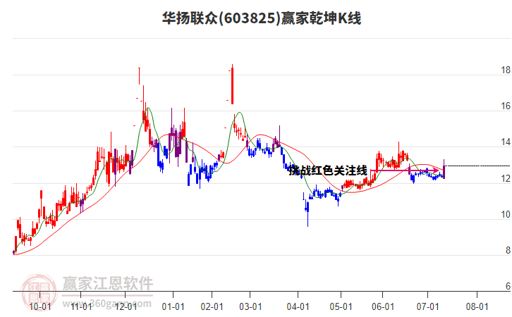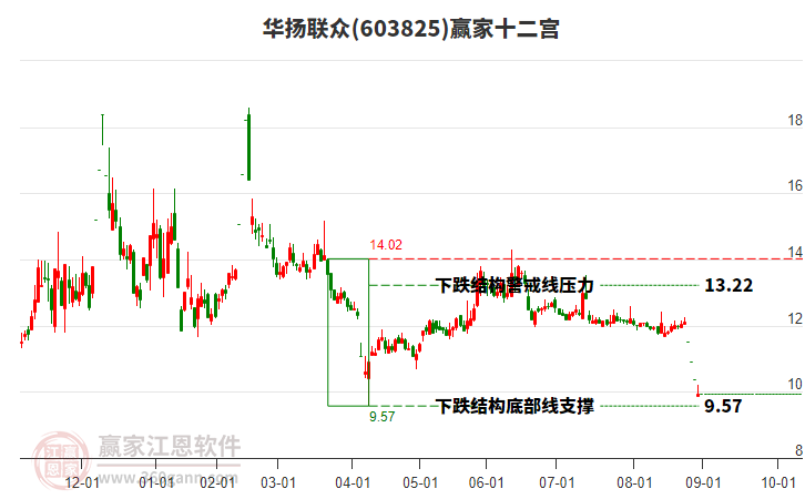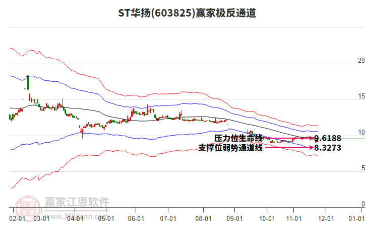 依據(jù)贏家江恩系統(tǒng)趨勢工具極反通道分析判斷華揚聯(lián)眾603825運行在生命線以下弱勢區(qū)域,根據(jù)規(guī)則該股短線輕倉參與,股價跌至弱勢外軌線后波段再結(jié)合其它工具信號建倉。應(yīng)用口訣是:生命線上強勢走,生命線下難抬頭;紅黃兩條外軌線,壓力支撐顯勢頭。