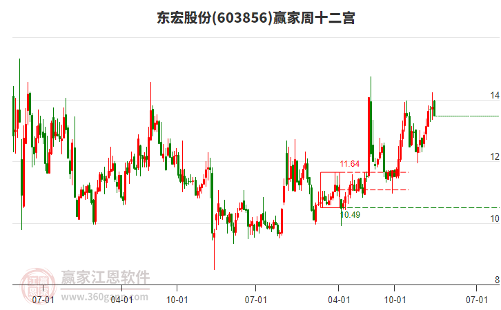 今日603856東宏股份最高價14.23上穿了贏家極反通道工具藍色外軌線,受到藍色外軌線強力壓制,最終收盤停留在在藍色外軌線與生命線上方的強勢通道區(qū)域。603856東宏股份近10個交易日漲幅2.87%