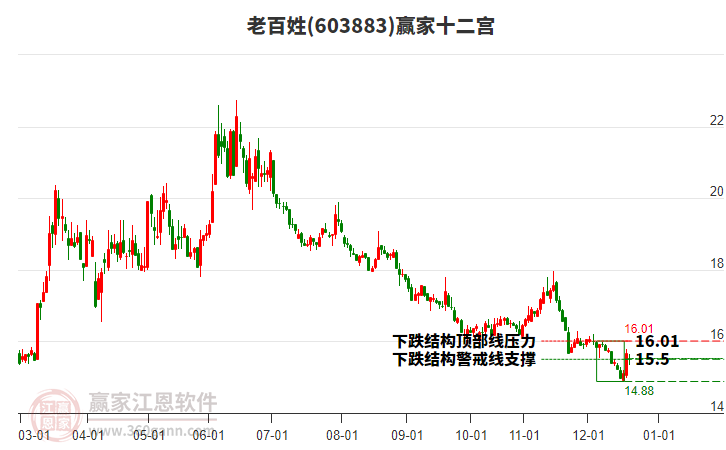 老百姓根據(jù)贏家江恩極反通道趨勢工具展示,上方壓力位15.5788,下方支撐位13.7979。老百姓處于贏家江恩空頭主線形態(tài),從1月23日形成頂分型后持續(xù)下跌,今日形成短期初次筑頂信號,短期多頭趨勢已被