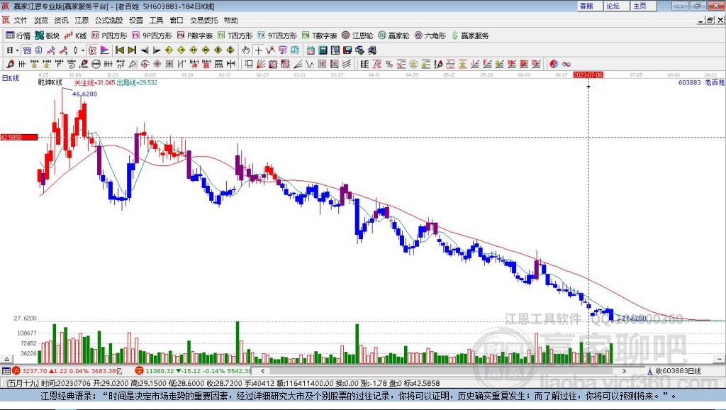 依據(jù)贏家江恩乾坤K線工具展示,本周K線以陰線收盤,目前股價處于藍色區(qū)域,位于關(guān)注線下方,關(guān)注線對當前股價形成壓制,短期看空。后市如若股價有效突破空頭出局線,則有望形成短期反彈(如不能突破空頭出局線,趨勢依然看空)。如跌破近期低點,后市將打開下行空間。