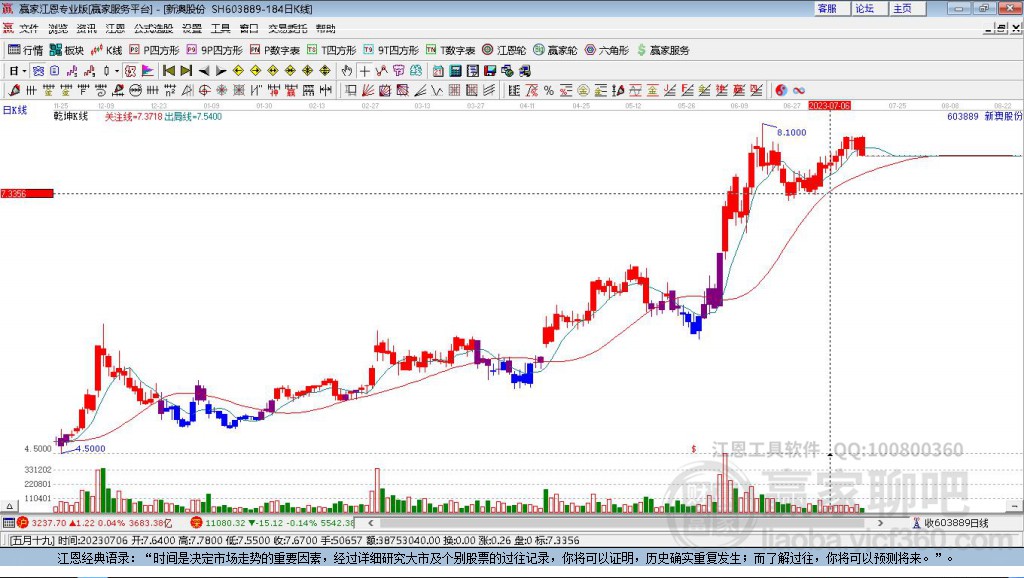 依據(jù)贏家江恩乾坤K線工具展示,本周K線以陰線收盤,目前K線處于紅色區(qū)域,位于關(guān)注線上方,依據(jù)贏家江恩乾坤K線多空模型,目前多頭出局線對當(dāng)前股價形成支撐,短期看多。后市如若股價跌破多頭出局線,則可能形成短期回調(diào)。