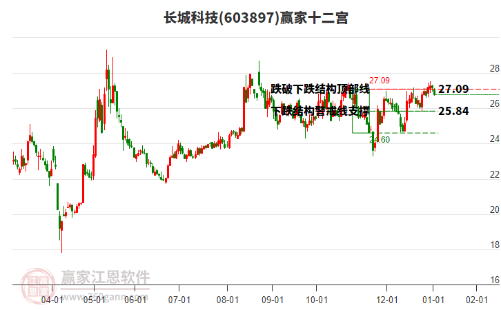 當(dāng)前股價(jià)位于前期2025年11月19日形成的下跌結(jié)構(gòu)頂部線27.09與警戒線25.84之間,今日微跌1.19%,以26.67元小陰線收盤。依據(jù)贏家十二宮多空能量守恒規(guī)則,下跌結(jié)構(gòu)警戒線是多空能量平衡爭奪點(diǎn),突破或跌破往往意味著平衡打破。當(dāng)前股價(jià)若能站穩(wěn)警戒線位置,多方能量有望主導(dǎo)上攻,向上頂部線位置尋找多空能量平衡位。如股價(jià)不能有效站穩(wěn)警戒線,則空方能量主導(dǎo)下探,向底部線附近尋找新的多空能量平衡位。