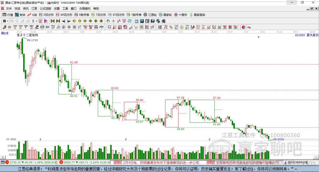 依據(jù)贏家江恩乾坤K線工具展示,目前股價(jià)處于藍(lán)色區(qū)域,本周K線以陰線收盤,周K線收于出局線下方。近期波段低點(diǎn)為2月6日26.5點(diǎn),若跌破前期低點(diǎn)26.5,將形成短期下行趨勢(shì),如短期股價(jià)快速進(jìn)入紅色區(qū)域,有望走出震蕩區(qū)域。